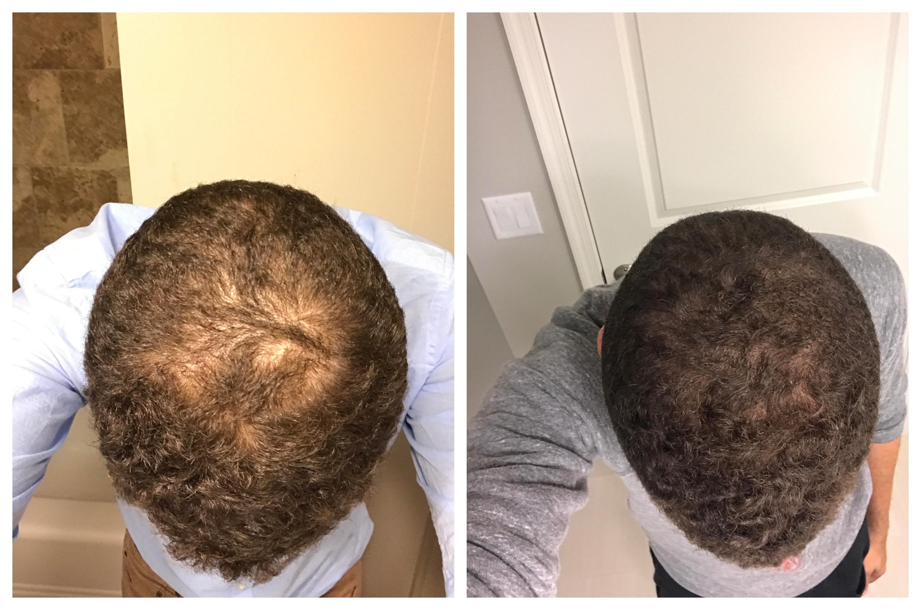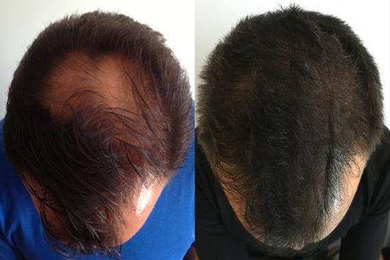 Ahmed avant et après six mois d'utilisation du minoxidil Vitanas. Résultat : une réduction significative de la chute des cheveux et une repousse des zones chauves du front.